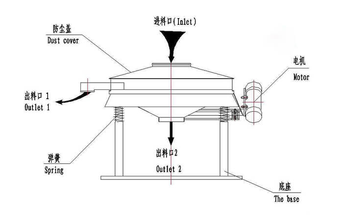 普通旋振篩:裝配一臺立式振動電機,利用立式振動電機作為激振源,在電機的帶動下物料在篩框做水平、垂直、傾斜的三維運動。通過不同目數的篩網過網完成篩分目的,具有自動篩分排料的功能。
