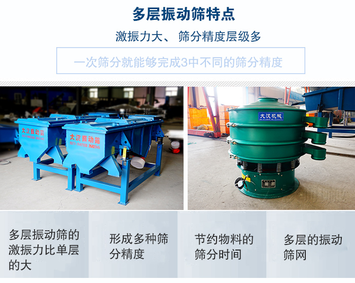 多層振動篩可對粉狀、顆粒狀物料的篩選和分級,廣泛用在塑料、磨料、化工、醫藥、建材、糧食、炭素、化肥等行業.