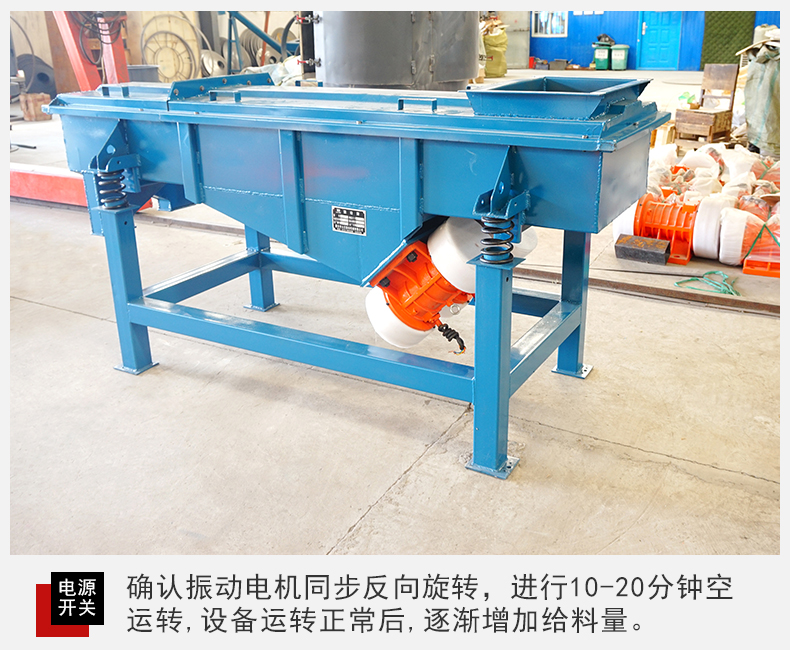 3、閉合電源開關(guān),確認(rèn)振動(dòng)電機(jī)同步反向旋轉(zhuǎn),進(jìn)行10-20分鐘空運(yùn)轉(zhuǎn),設(shè)備在運(yùn)行時(shí)如有異常聲音,應(yīng)迅速關(guān)機(jī)進(jìn)行檢查處理。設(shè)備運(yùn)轉(zhuǎn)正常后,可將少量需篩分的物料通過進(jìn)料口設(shè)入篩機(jī)內(nèi),確認(rèn)物料向出料口方向行進(jìn),然后逐漸增加到所需和所能承受的給料量。